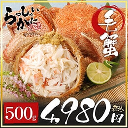 本場北海道では人気NO.1の毛がに!毛がにと言えばその濃厚でクリーミーな味わいにかにみそが有名ですが、小ぶりの身体にぎゅっと詰まったもっちりしたやわらかな身の味は絶品!らっしゃいかに市場では500g~1尾1kg超えの超特大毛がにまで様々なサイズの毛がにを通販することが出来ます。