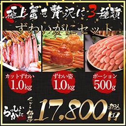 人気のズワイガニの盛り合わせ3点かにセットです!かにを通販するなら此方のセットが間違いなし!カットズワイガニ、幻のズワイガニ1kg姿、ズワイガニポーションが入った当ショップ1番人気のセットメニューです。