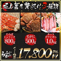 豪華3種類の極上三大かにセット(タラバガニ脚特大800g&毛ガニ500g&カットズワイガニ1kg)×5セット80,000円