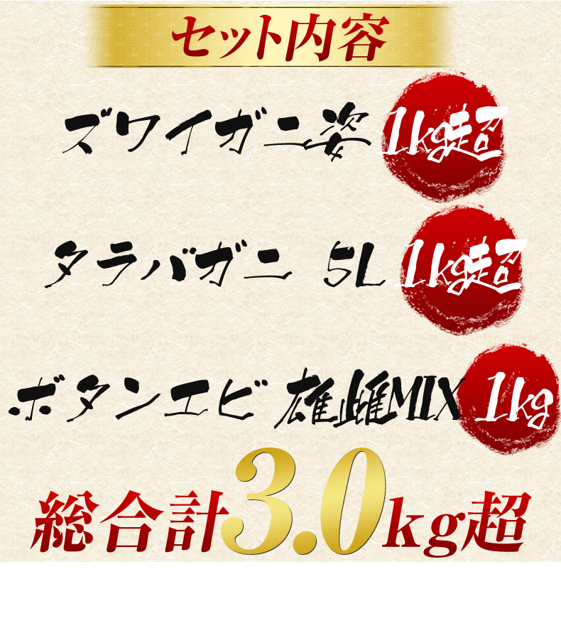 ※注意事項※ 当商品(5Lタラバ脚)はまれに1肩/1.5kg〜2kgの大物が混ざっており、調整で脚または爪を切る場合がございます。