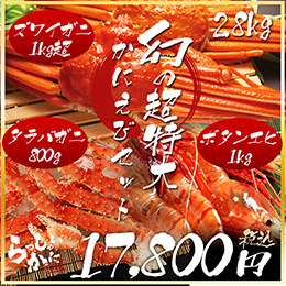 かにえび幻の超特大セット タラバガニ800g カットズワイガニ1kg 幻のボタンエビ1kg(オス500gメスたまご付き500g)51,000円(税込)